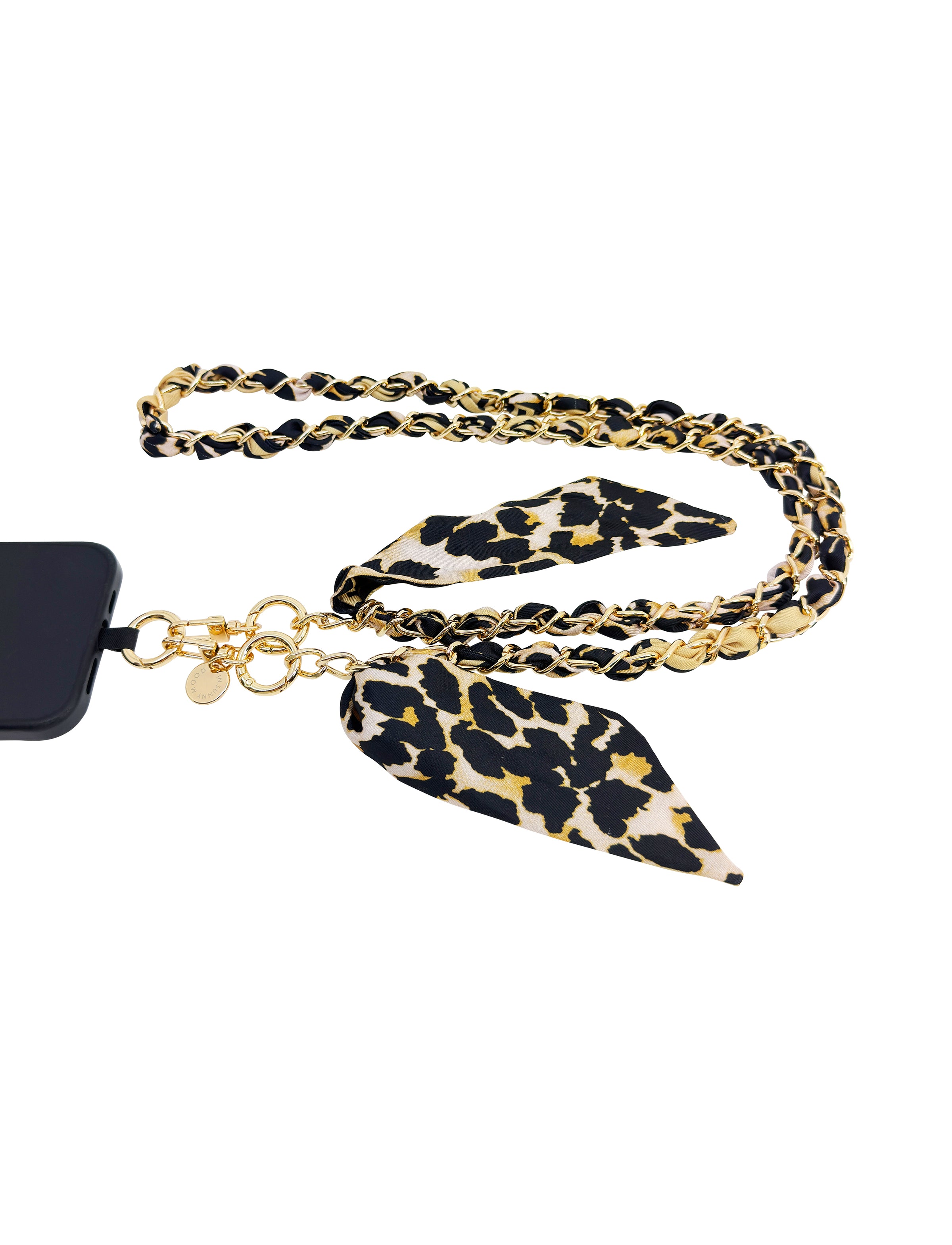 Långt mobilstrap med mjukt viskostyg som är inflätat i en guldkedja. Tyget sticker ut en bit som en snygg detalj, men kan enkelt dras ut om du vill ha ännu mer längd. En stilren och bekväm accessoar som kombinerar funktion med en lyxig känsla.